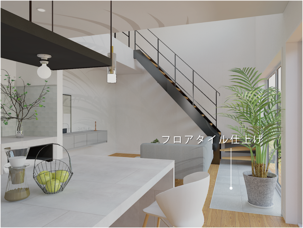 白・グレー・木目で統一した空間に、黒のスケルトン階段と手すりがアクセント。