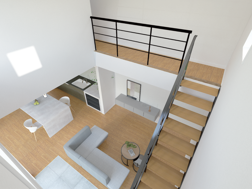 吹き抜けから光が落ちる、開放感あふれるLDKです。