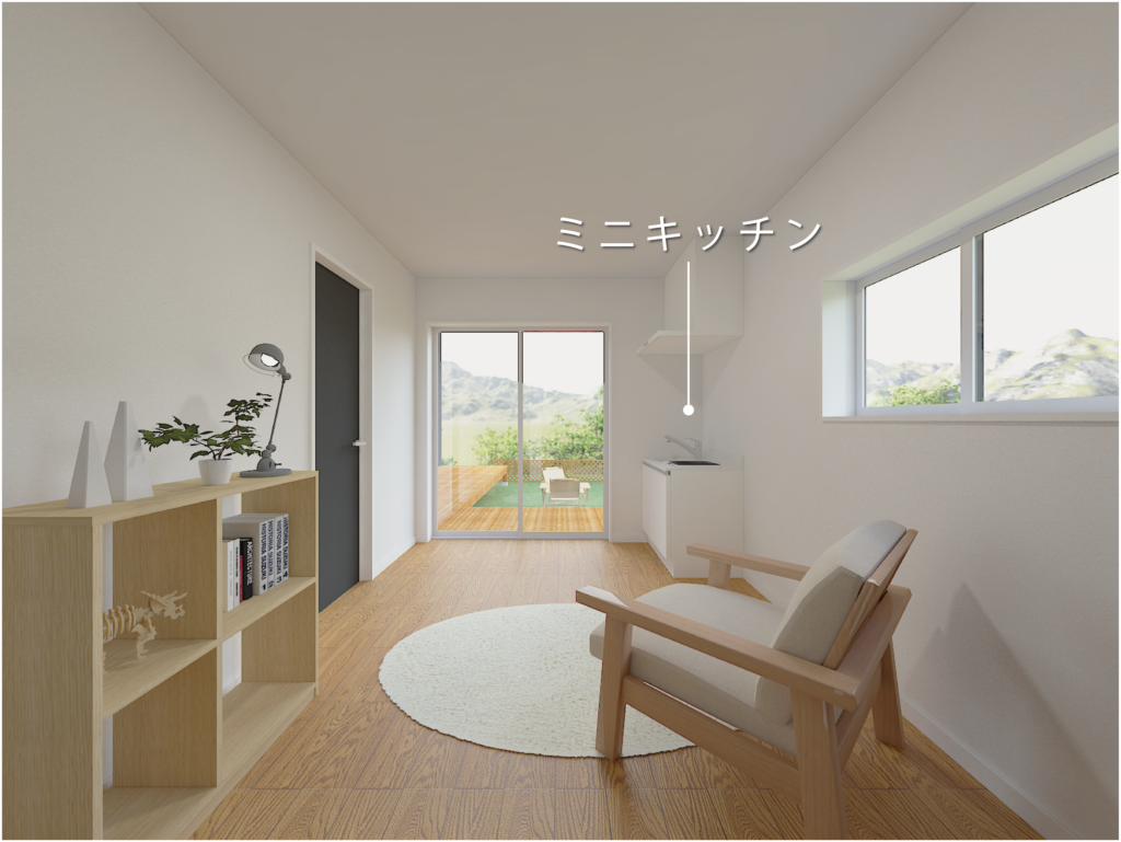 1階にはミニキッチン付きの洋室を設け、生活リズムの異なる家族がそれぞれ無理なく過ごせる空間を計画。